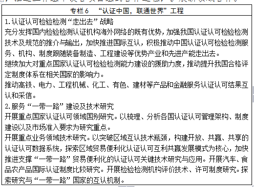 深入落实“走出去”战略。以自由贸易区及“一带一路”沿线国家为重点,加强“走出去”战略研究和政策推进。在行政审批、结果互认、认可服务、创新支持等方面,为认证认可检验检测服务出口集中区域提供支持。加强部际合作,建立健全“走出去”联动机制,推动认证认可检验检测“走出去”相关政策制定和实施,加大“走出去”投融资支持措施,推进认证认可检验检测与政府援助项目、政府招标项目、亚投行项目等的深度融合,鼓励检验检测认证机构通过各种形式进行资源整合,充分利用国际国内两个市场、两种资源,增强竞争能力,加强风险防范,积极推动中国认证认可检验检测服务、机构、制度跟随装备制造、工程建设等优势产业和先进产能“走出去”。